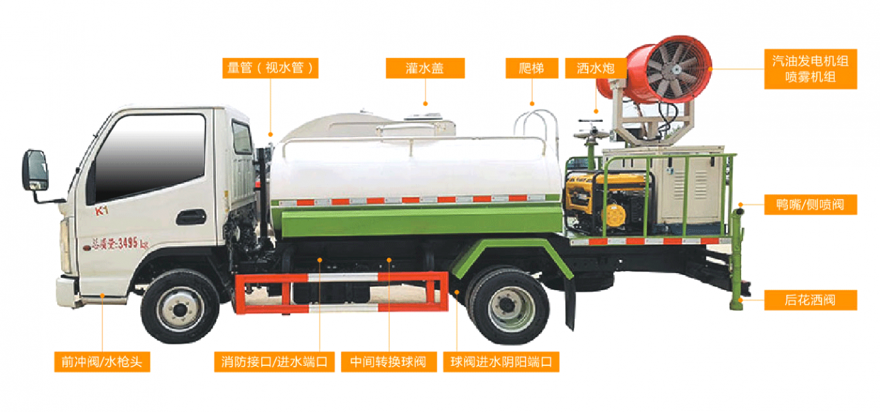小巧精悍 短軸(2800軸距)大動力(濰柴130馬力),圓罐藍牌4.5方抑塵,可選裝不帶霧炮,(整備質量3300kg-3600kg)妥妥不超重。