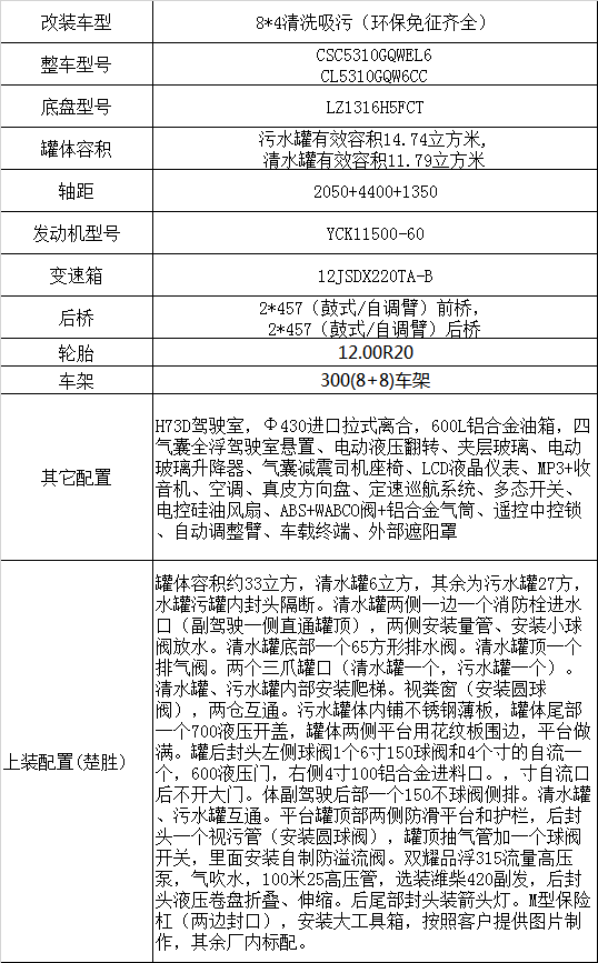 2*457前橋,后橋2*457鑄鋼/4.875,發動機YCK11500-60,12JSDX220TA-B,Ф430拉式離合,板簧11/11/13,300(8+8)車架,600L鋁合金油箱,國產方向機,12.00R20,全氣囊駕駛室懸置、電動液壓翻轉、夾層玻璃、電動玻璃升降器、氣囊減震司機座椅、金屬漆、電動電加熱后視鏡、LCD液晶儀表、自動空調、真皮多功能方向盤、定速巡航系統、多態開關、電控硅油風扇、WABOC閥(空氣處理單元、駐車手控閥、制動總泵)、鋁合金貯氣筒、ABS、中控鎖、自動調整臂、右轉提示音響、165AH電瓶、雙騎馬螺栓、行駛記錄儀、MP5、倒車影像、T-BOX