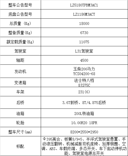 半浮式駕駛室懸置,發(fā)動機(jī)YCS04200-68,3.6T前橋、8T/4.875后橋,8JS75C,板簧8/9+5,231(6)局部加強(qiáng)車架,200L油箱,10.00R20,手動液壓翻轉(zhuǎn)、夾層玻璃、電動玻璃升降器、機(jī)械減震司機(jī)座椅、空調(diào)、ABS、車載終端,ABS、免維護(hù)電池、車下起動停機(jī)功能、駕駛室電源總開關(guān)、PTO開關(guān)