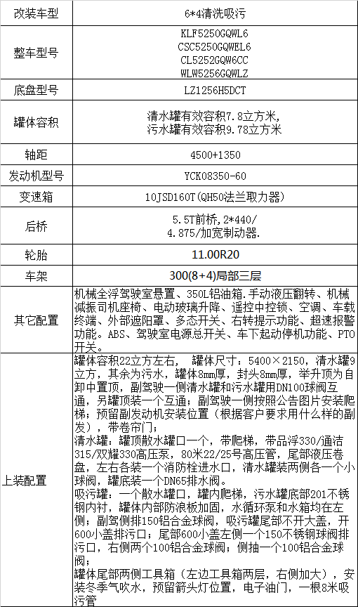 5.5T前橋,2*440/4.875/加寬制動器,10JSD160T(QH50法蘭取力器)。300(8+4)局部三層。350L鋁油箱。11.00R20.手動液壓翻轉、機械減振司機座椅、電動玻璃升降、遙控中控鎖、空調、車載終端、外部遮陽罩、多態開關、右轉提示功能、超速報警功能。ABS、駕駛室電源總開關、車下起動停機功能、PTO開關。