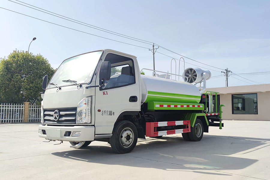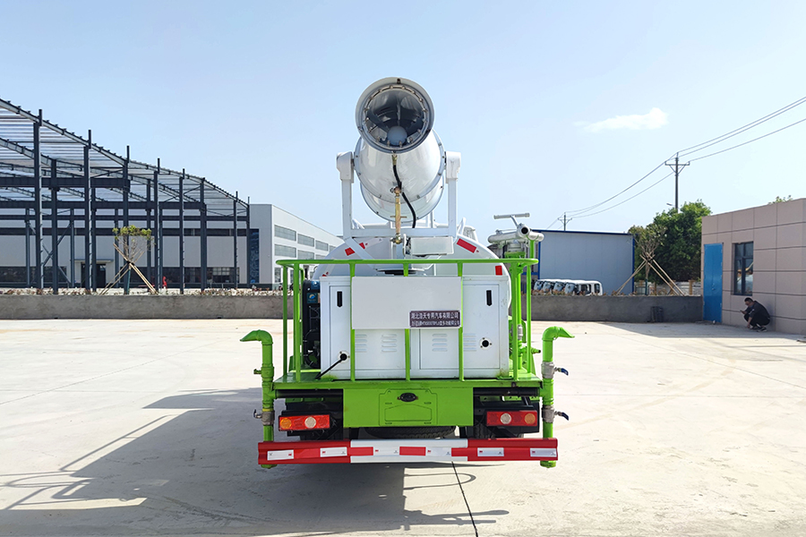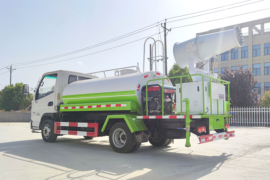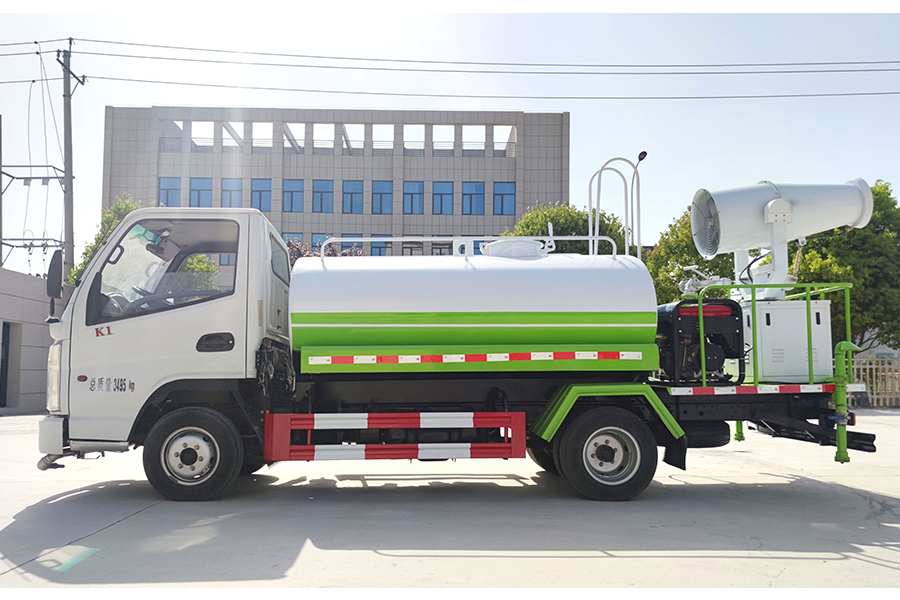罐體采用標準Q235碳鋼制作,罐體自動焊,裝水3噸,配大功率專用灑水泵,可自吸自排,前沖后灑,側噴,主管道加粗,大通徑球閥,直通球閥式消防接口,帶后工作平臺,帶高炮。尾部大平臺,加裝30米噴霧機。環保、免征齊全。