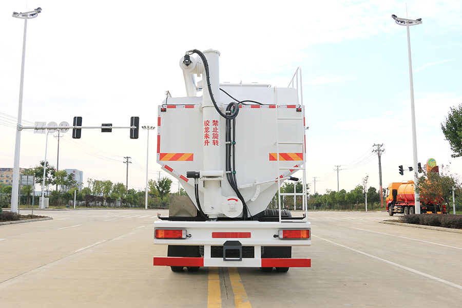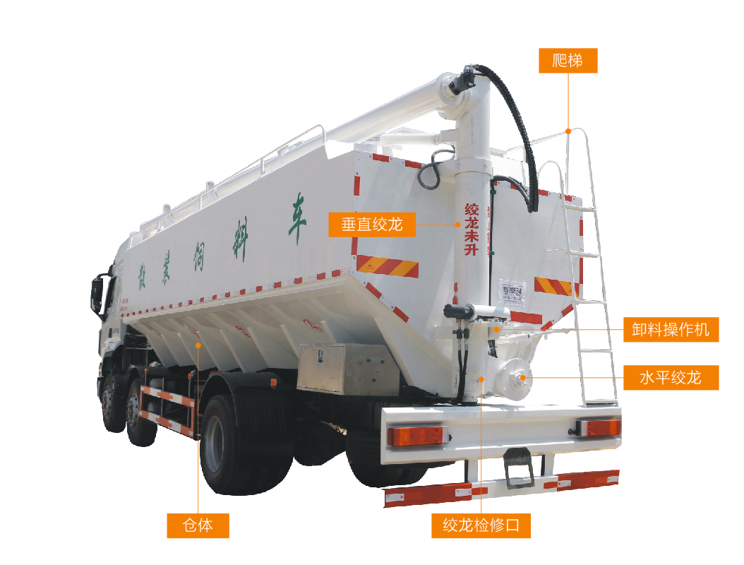 散裝飼料車的飼料罐架設(shè)在卡車的底盤上,罐頂開有進(jìn)料口.頂部的一根螺旋輸送卸料管(俗稱卸料絞龍)則可自由回轉(zhuǎn)和抬升,抬升的仰角可達(dá)60度。運(yùn)輸時(shí),頂部的螺旋管平臥在罐頂;卸料時(shí)則抬起,使管端的出料口與畜禽飼養(yǎng)場(chǎng)貯料罐頂部的進(jìn)料門相接,駕駛室內(nèi)裝有操縱裝置(操縱裝置也可裝置在罐體尾部),卸料時(shí)通過(guò)車底的動(dòng)力輸出軸和減速器來(lái)驅(qū)動(dòng)螺旋,以完成卸料。目前國(guó)內(nèi)主要推出3T、5T、8T、11T、15T和22T等多個(gè)噸位車型。