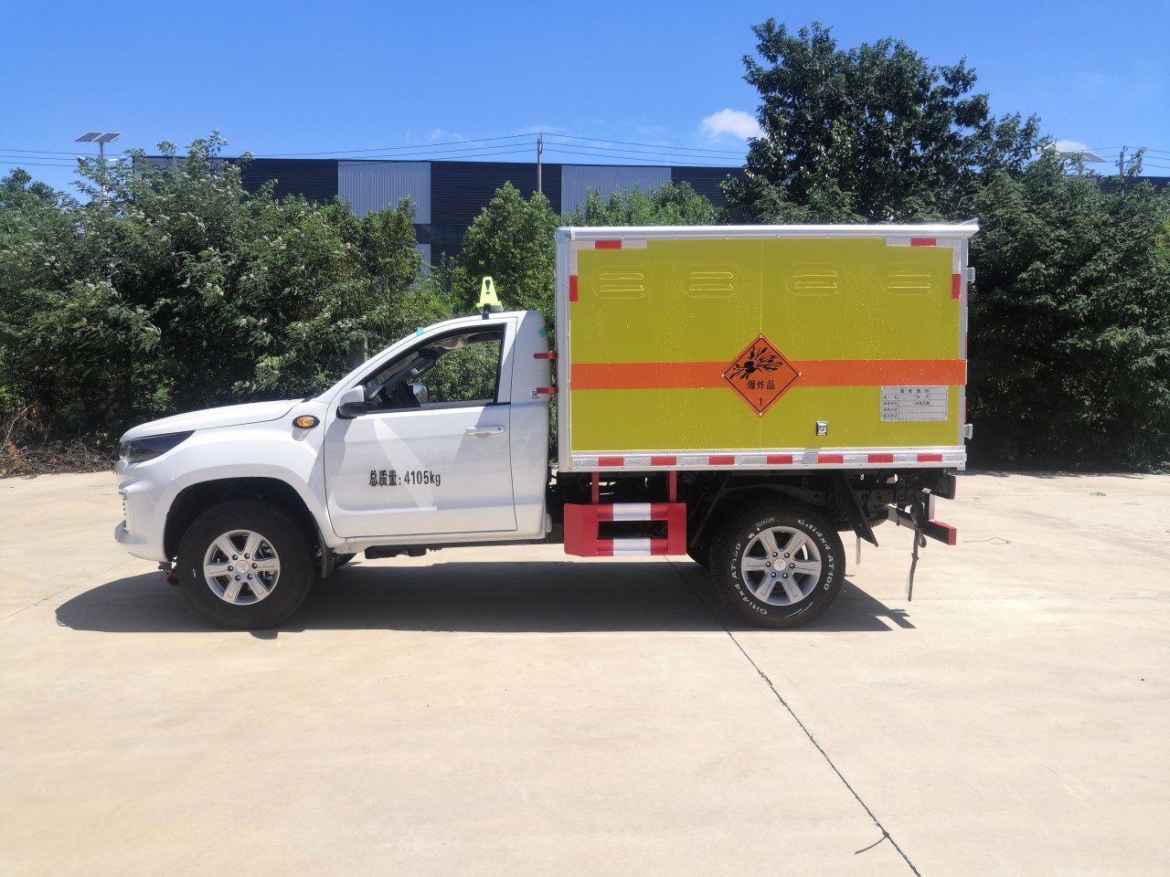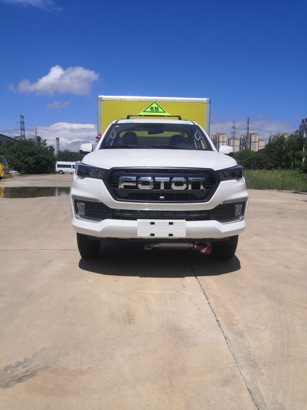 福田重載法規藍牌皮卡底盤,總質量4105kg,3110軸距,單排駕駛室,歐康柴油2.5T發動機 ,4*4驅動,前雙叉臂式結構獨立懸架+后鋼板彈簧非獨立懸架,前盤后鼓,遠近光一體透鏡大燈,有晝行燈,側轉向燈(重載法規 要求),離地間隙210mm,BA剎車輔助 ,前7.00R16后265/65R17輪胎,多功能方向盤、電動空調,藍牙、無側踏板 ,76L油箱,8吋屏幕MP5 ,4G-T-BOX,一鍵啟動